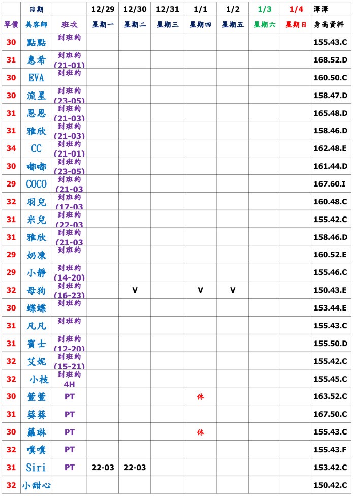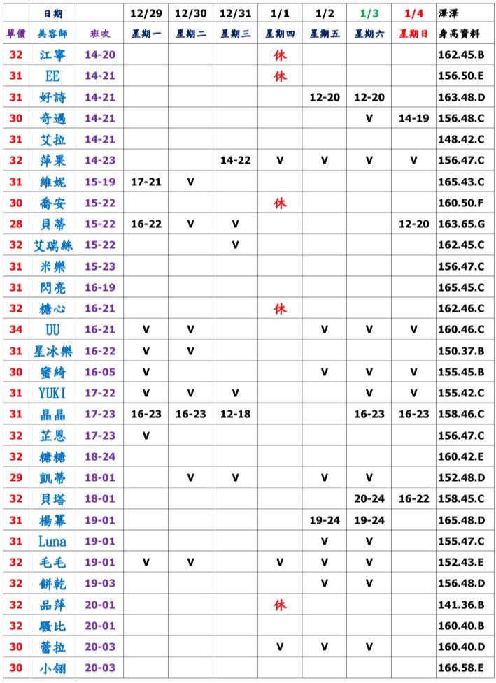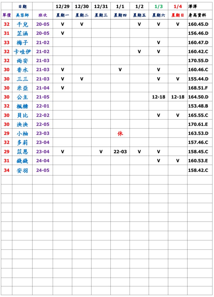 營業時間:PM12:00 ~ AM06:00(AM05:00最後收客)星期日為美容師最少的日子!