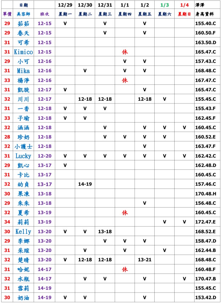 有打勾即有報班,若是寫時段,代表當日為該上班時段
