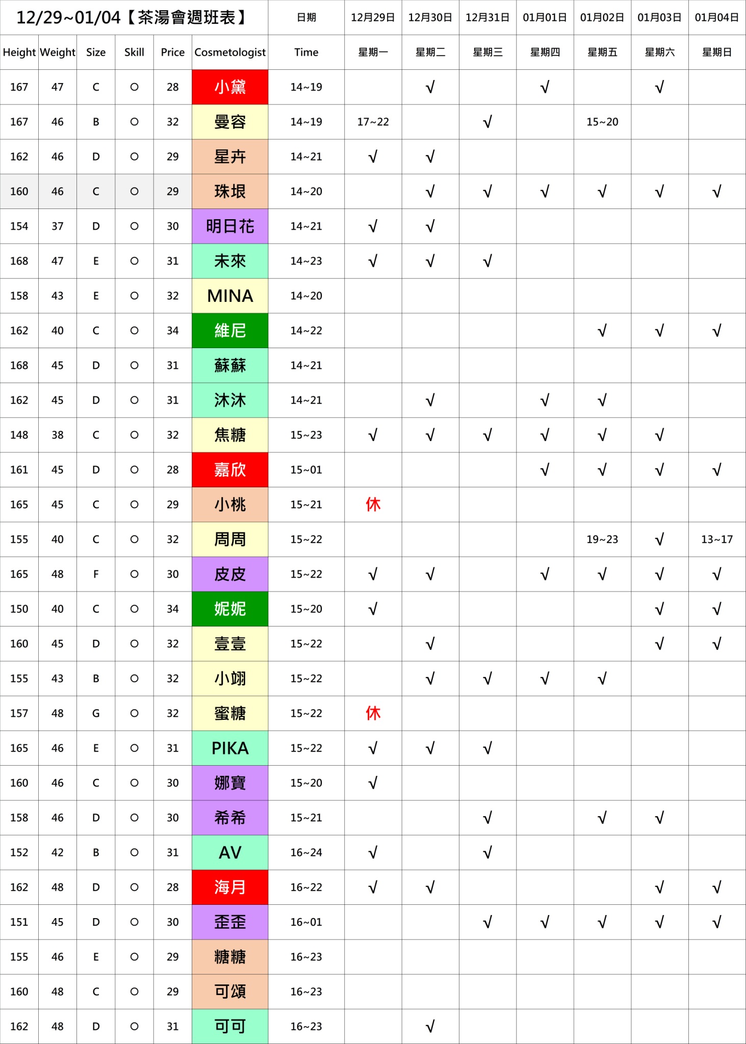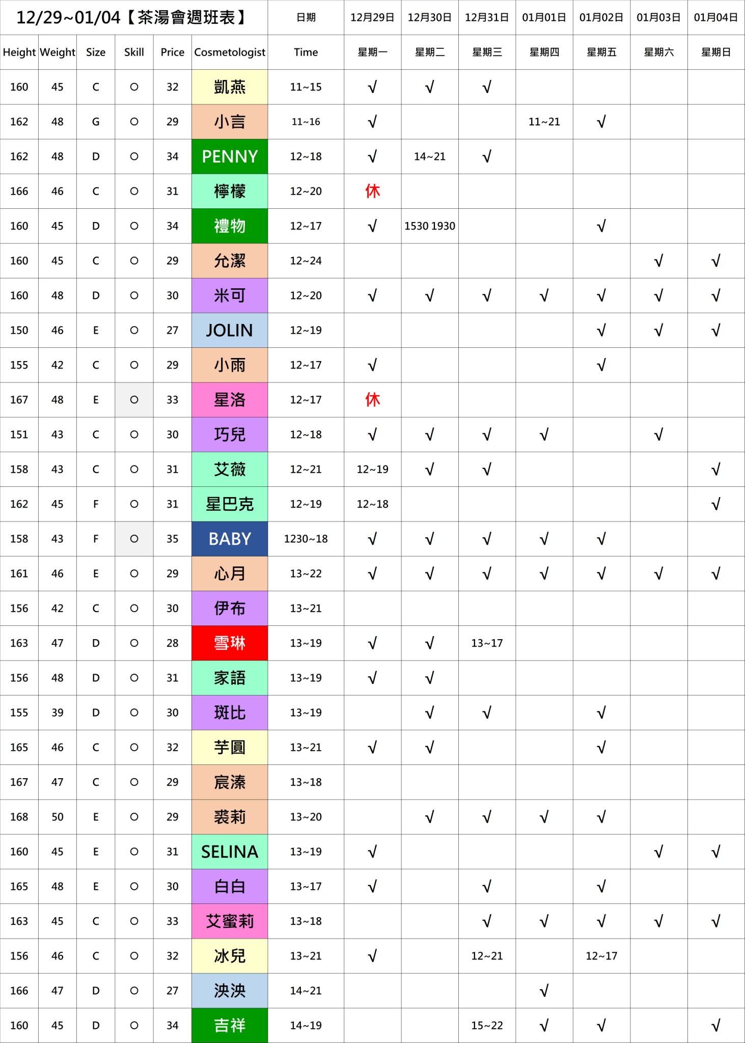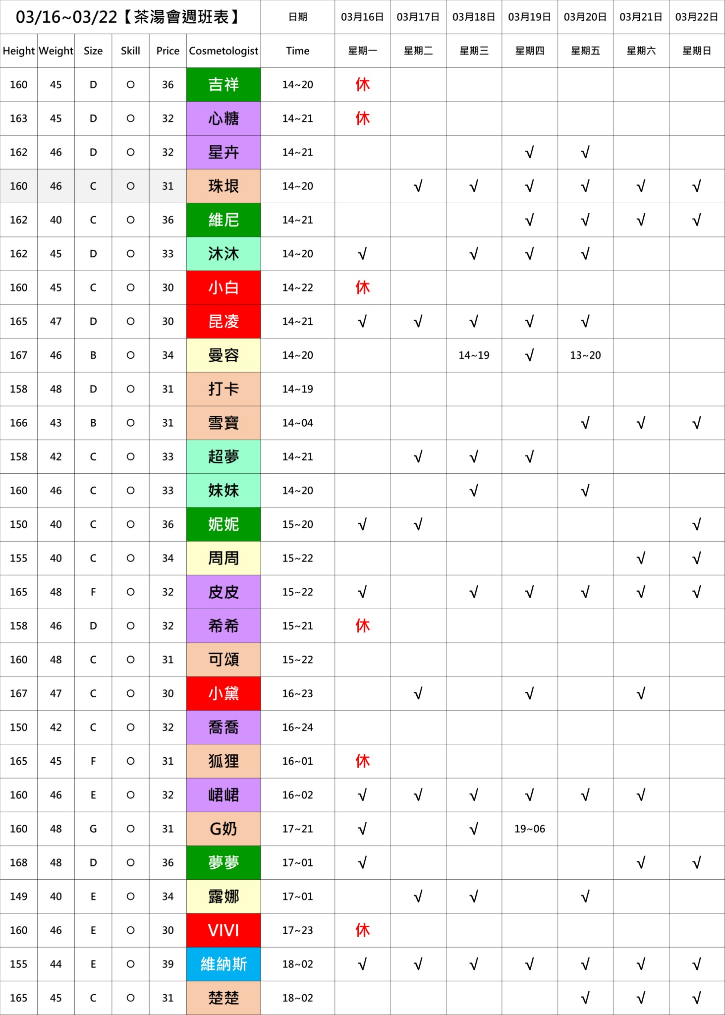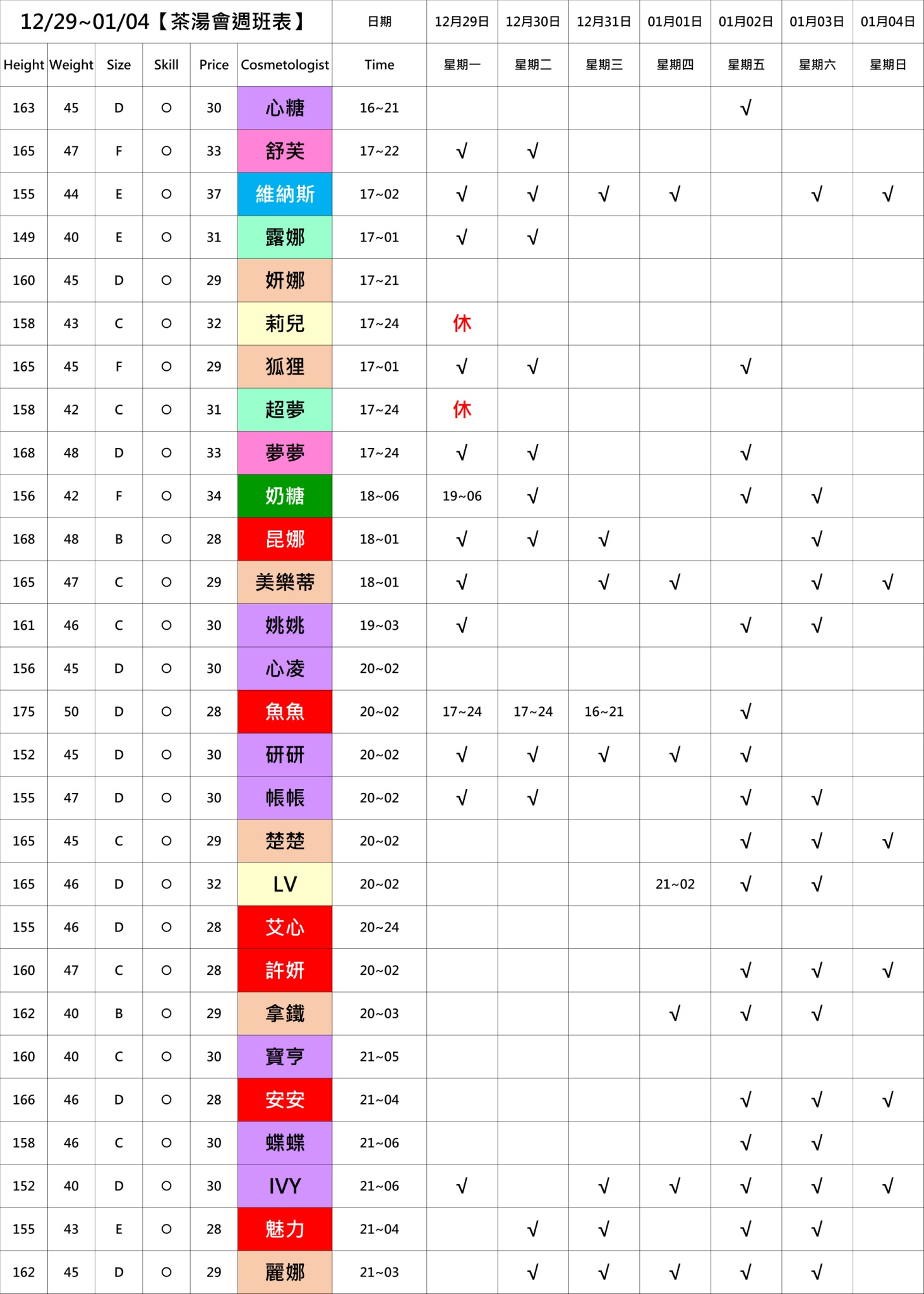 營業時間:PM12:00 ~ AM06:00(AM05:00最後收客)星期日為美容師最少的日子!