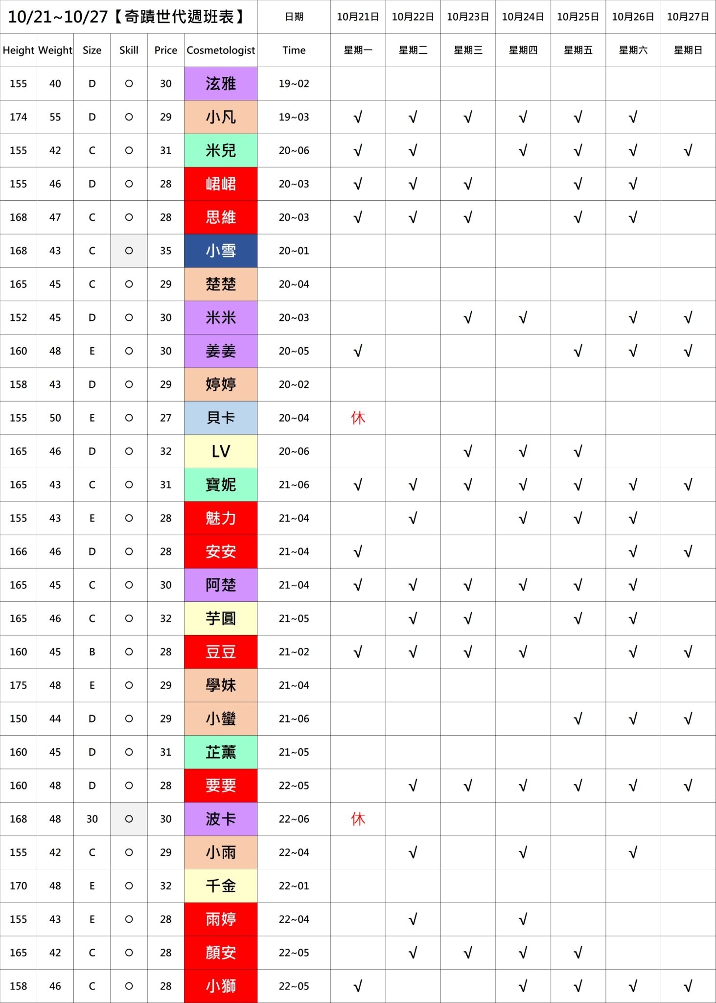有打勾即報班,若是寫時段,代表當日為該上班時段