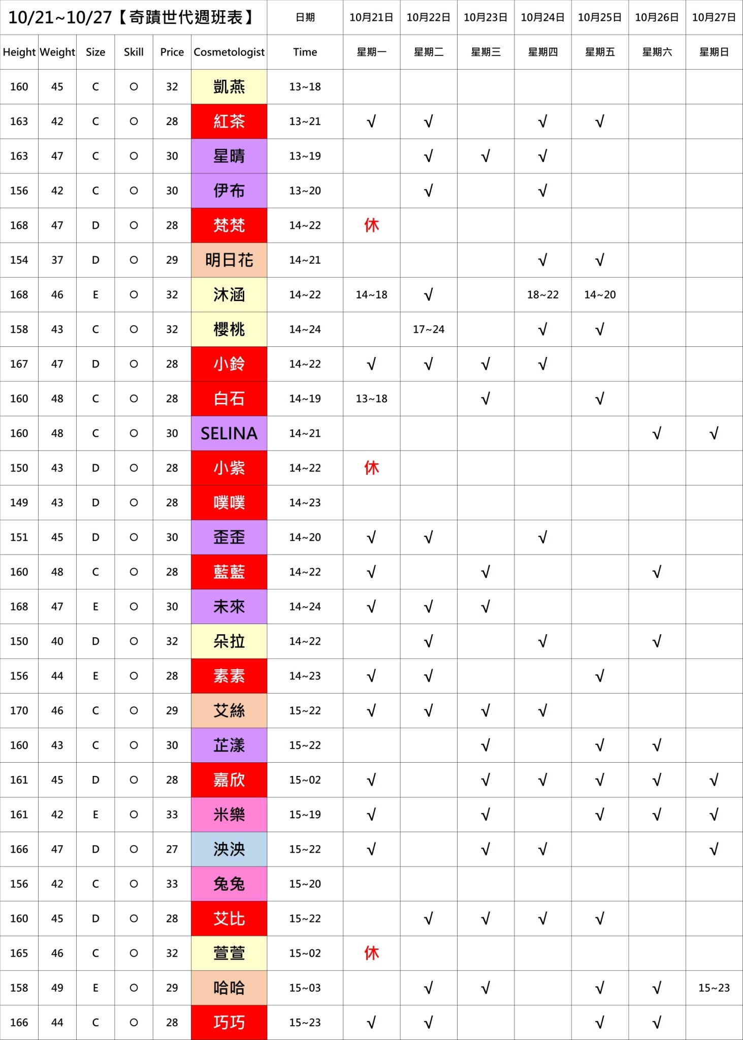 新竹館班表:28=NT2800 以此類推